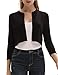The high stretchy shrug cardigan features 3/4 sleeve, crew neck, hook-and-eye closure at neckline and cropped design.