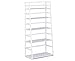 4 tier metal etagere bookcase with evenly spaced white wooden shelves