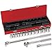 Thirteen 12-point sockets: 7/16-Inch, 1/2-Inch, 9/16-Inch, 5/8-Inch, 11/16-Inch, 3/4-Inch, 13/16-Inch, 7/8-Inch, 15/16-Inch, 1-Inch, 1-1/16-Inch, 1-1/8-Inch, and 1-1/4-Inch