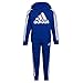 Top features long sleeve full zip front hooded jacket with ribbed neckline, sleeve cuffs, and bottom band, kangaroo pocket, applied 3-Stripes down sleeves & adidas Badge of Sport screen print on front