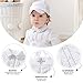 ♥*♥* The bodyshirt of boys white suit elegant vertical pin-tucking style trim with silver bindding in front openning and the edge of collar ;a removble bow tie fixed by buttons hide under collar; adjustable suspenders pants motif by silver embroidery cross on front waist pannel ;this make the baby boys' christening clothing quite different than others ; a hat match the white baby boy outfit make your little man infant toddler dress more special and different