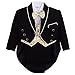 5 Pieces boys tuxedo formal suit set: Tuxedo Jacket with tails, White Dress Shirt, adjustable Gold Bow Tie, Gold Vest and Pants. Made of luxurious polyester fabric with solid satin details.