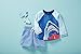 2-piece set. Nylon spandex shark rash guard pairs with peached nylon swim trunks with twill tape waist ties. UPF 50+.