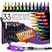12-pack of markers includes: black, purple, dark blue, light blue, dark green, light green, yellow, orange, brown, red, hot pink, and peach ink colors