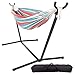 ✅ DESIGN SPECIFICATIONS —Vibrant stripe pattern — Hammock made of heavy duty cotton fabric that is dye-treated for UV resistance — Machine Washable —Solid wood Spreader bar — Accommodates 2 people — 450 pounds weight capacity — Package Includes: steel frame, hammock bed, hardware, and instructions — Fits hammocks ranging from 9.8 ft to 12 ft — Hammock bed measures approximately 75" X 55" — Frame Measures approximately 147" X 47 " X 47"