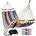 【High Quality Double Hammock】The double camping hammock made of cotton canvas, load Capacity Up to 450 Lbs, enough to accommodate two adults. Hammock display size: 98 inches long x 59 inches wide, bed size: 73 inches long x 59 inches wide. The hammock can be used in a hammock stand or tree with a length of 8.5-10 feet.
