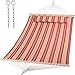 Comfortable and stylish: This quilted hammock with pillow is made from dye-treated polyester material, which provides UV-resistance to add longevity. This outdoor hammock also features hardwood spreader bars to maximize both comfort and style.