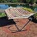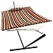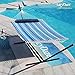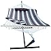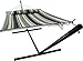✅ DESIGN SPECIFICATIONS —Vibrant stripe pattern — Hammock made of heavy duty cotton fabric that is dye-treated for UV resistance — Machine Washable —Solid wood Spreader bar — Accommodates 2 people — 450 pounds weight capacity — Package Includes: steel frame, hammock bed, hardware, and instructions — Fits hammocks ranging from 9.8 ft to 12 ft — Hammock bed measures approximately 75" X 55" — Frame Measures approximately 147" X 47 " X 47"