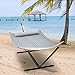 【Superior Comfort Experience】Our 2 person hammock with stand included is made out of weather resistant spun polyester sleeping pad, with hardwood spreader bar, detachable pillow, and cotton natural ropes ends. Suitable for outdoor and indoor use.