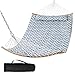 【Quilted Hammock】The double-layered quilted polyester with inner polyester padding and the polyethylene-stuffing head pillow offers you superior comfort. The 55-inch hardwood spreader bar is powder coated in an oil-rubbed finish, making it more stylish and stable. Handcrafted polyester ropes add character and authenticity, and thickness of the end cords contribute greatly to the balance and strength of the hammock.