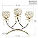 Simple yet elegant shiny gold curve structure holds 3 crystal bowl candle holders. Crystal dangles under each bowl add additional touch.