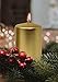 SIZE: 2.4" diameter x 3" height (60mm x 100mm). PACK: 6-pack. COLOR: Gold. BURN TIME: 36-hour burn time. FITS: Standard candle holders for pillar candles. CANDLE: Metallic with a smooth and shiny finish. WICK: Smokeless, 100% cotton lead-free wick, self extinguishing.