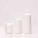 This bulk set includes 3 pillar candles in white, measuring 3" diameter x 4" H, 6" H, and 8" H.
