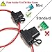 【12v Inline fuse holder for standard blade fuses 】-Fuses holder kit including 12PCS 14 AWG inline fuse holders with 60PCS standard car fuses (2A,3A,5A, 7.5A)X5PCS+(10A,15A,20A,30A)X10PCS . The auto fuse size:19mm x 5mm x 18.5mm.14 Gauge Waterproof Pigtail In-line Fuse Holder can support fuses rating of 1A 2A 3A 4A 5A 7.5A 10A 15A 20A ATC/ATO blade fuse.