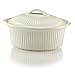 Casserole is made of ceramic stoneware with glossy classic white finish; Microwave, dishwasher, and oven safe; Take it straight from the oven to the table for everyday or special occasions