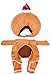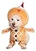 Walking gingerbread man pet costume includes jumpsuit with false arms and headpiece; features white ric rack trim, sequin "gumdrop" buttons and red sequined fascinator hat