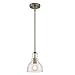 One-light Mini Pendant with hand blown clear seeded glass shade and Antique Brass finish adds retro style