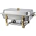 Quality craftsmanship, The lid hooks onto the attached holder to stay out of the way throughout service. One fuel holder in the center distributes the perfect amount of heat to keep your food at desired temperature. The sophisticated gold accents make this chafer picture-perfect for upscale catered events, weddings, and elegant buffets.