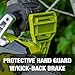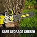 [SAFETY FEATURES]: Protective hand guard with kick back brake for superior safety + control; a built-in safety switch to prevent accidental starts, and sheath for safe storage after use.