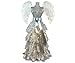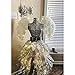 A sparkling silver dress form features lovely feathered wings, shimmering pine needles and illuminating clear lights