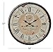FEATURES ROUND WALL CLOCK: Between the distressed wood with rust look and the Roman numerals, ornate graphics, and decorative hands, this antique-inspired wall clock adds plush vintage personality to any room in your home