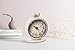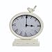 Features a desk clock with a bird perched on top of the face