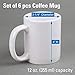6 mugs per set, each mug holds 12 oz. Perfect for Coffee, tea, hot cocoa, soup and more