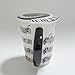 This stylish bone china mug and lid set is decorated with vertical music staves and notes on the mug and a spiral keyboard on the lid.
