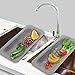 👍【MODERN DESIGN】This over sink strainer basket adopts a unique expandable design (from 34cm to 48cm), you can adjust the length according to your needs to fit different sink sizes, there are 4 support columns at the bottom for countertop convenience Use, and it comes with a hanging hole, when you don't use it, you can shrink it or hang it, save space and bring more convenience to your life.