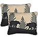 The Your Lifestyle microfiber quilt set features a striped Northwest pattern arranged in horizontal stripes. Bears and pine tree silhouettes alternate throughout. The reversible lining is an arrow pattern on ivory.