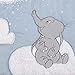 Features elephants, clouds, sleepy moons, and stars in shades of chambray blue, taupe, white and navy