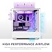 Full White High Airflow Mesh Design: Say goodbye to stuffy builds with the Full White High Airflow Mesh Design. The front panel is fully meshed from top to bottom, and 2 side air vents ensure rapid delivery of cold air to the inside of your case.