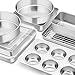 VERSATILE SET - 8-piece includes the most popular and usual bakeware set: 6x2 Inch Round Cake Pan Set of 2, 9.8x7.4x2 Inch Lasagna Pan, 9.8x7.4x1 Inch Cookie Sheet with Cooling Rack, 8.5x4.3 x2.5 Inch Loaf Pan, 11.4x7.1 Inch Muffin pan, 9 Inch Pizza Pan