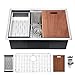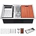 ★【Spacious Single Bowl & Custom Premium Accessories】The 10" deep single bowl kitchen sink adds valuable counter space, R10 unique inside corners offer a slightly curved corner for easy cleaning while amaintaining a resolutely modern look.The package incuded: 32" x 19" x10" undermount stainless steel sink,cutting board(made of solid sapele hardwood),dish drying rack, colander basket,bottom grid,strainer and drain cover,installation manual, cut-out template.