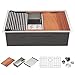 π FREE ACCESSORIES - Mocoloo 32-inch kitchen sink comes with hardwood cutting board, deep colander, stainless steel bottom rinse grid, basket drain strainer assembly with decoration cap, roll-up dish drying rack, a pack of hardware, installation instruction, cutout template paper.
