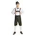 Mens lederhosen costume includes dark green shorts with attached braces, a white shirt and a matching red rimmed hat