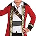 High-quality pirate costume with fantastic accessories; the top features gold metallic trim and attached vest; the red and black pants include attached boot covers; the belt has gold trim and a detachable sash; the hat has an attached bandana; skull and bone prints throughout