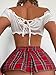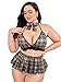 Features: 3 pieces, plaid print, lace trim, halter, bralette, skirt and bow tie