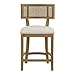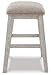 UPHOLSTERED COUNTER STOOL: This upholstered stool invites you to raise the bar on small space living. Comfortably cushioned stools sport a grayish white finish with rub-through effect for timeworn appeal