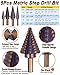 5 Pack HSS Titanium Coating Step Drill Bits: 3/16-1/2'', 1/8-1/2'', 1/4-3/4'', 3/16-7/8'', 1/4-1-3/8'', suitable for sheet metal, wood board, plastic, aluminum alloy, copper, NOT recommended for high carbon steel, hard metal.