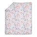 The baby comforter, with shades of pink and aqua play against a white ground with shimmery gold metallic accents, with flowers and butterflies tossed together on a brushstroke background. The reversible comforter features a crib sheet matching design on the back; two times the styling options. Perfect as a nursery accent or a clean, soft surface for tummy time