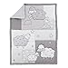 Includes 1 comforter, 1 tossed animal fitted crib sheet, 1 gray crib skirt, and 1 storage organizer