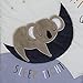 Features elephants, clouds, sleepy moons, and stars in shades of chambray blue, taupe, white and navy