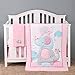 【Excellent Design】This is a elephant theme crib bedding set for girls,many cute elephants embroidery on crib comforter;the fitted sheet with elastic can be well fixed on the mattress,does not slip away when baby sleeping. The 10inch depth 4sides crib skirt can keep your crib clean and also decorate your crib beautifully.