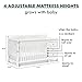 ADAPTS TO YOUR GROWING BABY: Adjustable mattress support base with 3 different height options; Designed to fit any standard full-size crib & toddler mattress; This baby crib may be used until your child can easily climb out or is taller than 35in (89cm)