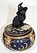 This magical little jar displays a black cat, sitting atop its lid seemingly looking up from reading a magical tome; a wonderful place for storing your jewelry and magical tools. 6”
