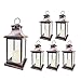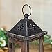 STURDY BUILD - This decorative lantern is made from supreme quality wrought iron material with rust-resistant powder coating which is durable but lightweight for long-time use. Four glass window panes let light flicker through and protect the flame from drafts which is great for outdoor and indoor use. Place a candle(up to 7" dia) inside the lantern to illuminate your space in a soft and dreamy glow. Measures 5 1/2"W x14 4/5"H.