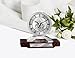 Luxurious tabletop mantel lunar circular rosewood desk clock design with black engrave plate and silver personalized text message. Nice gear display round shape clock has elegant roman numerals with see through dial clock face and deluxe quartz movement