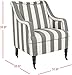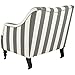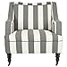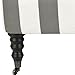 The grey-blue and white striped upholstery and black finish of this ottoman will create a perfect accent to your home