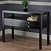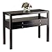 Bring the classic simplicity of Sandinavian design to your entryway, hallway, or dining room with the Copenhagen Console Table. Eye-catching with a lamp or vase in the living room, and practical in the entryway with a basket for keys and gloves near the front door. Use the console to display serveware and keep extra silverware and placemats handy in the dining room. Two drawers with silver satin knob accents provide additional storage. Made of solid and composite wood in a smooth Espresso finish.